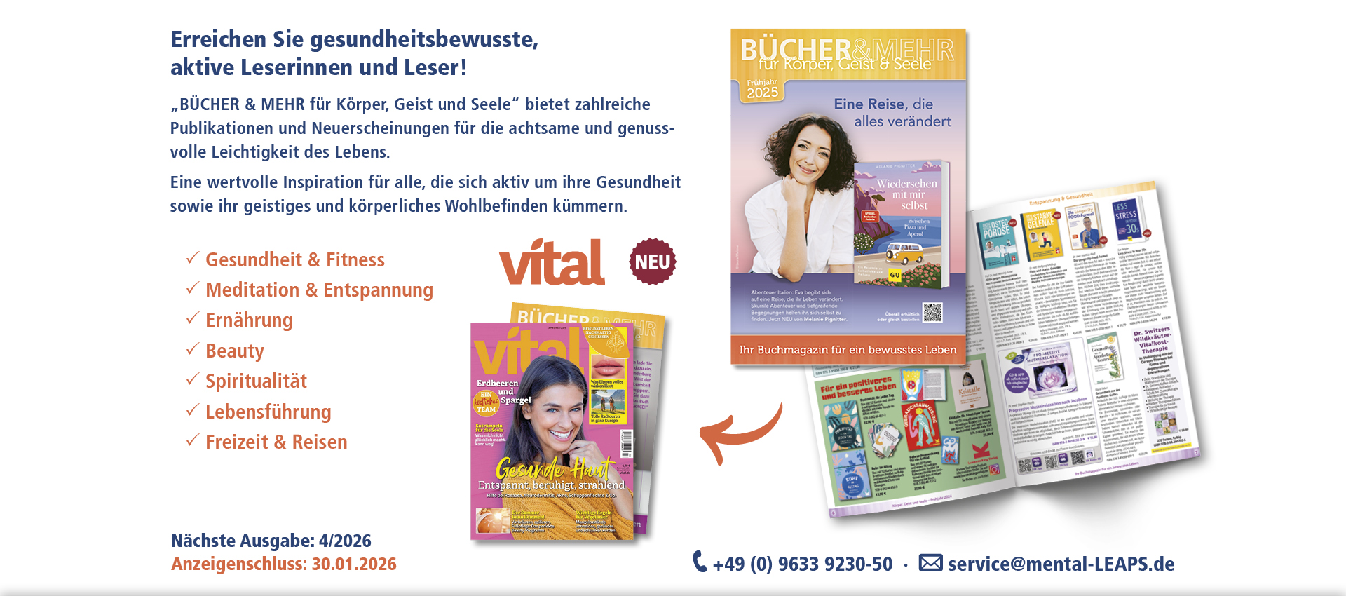 Mental Leaps steht für geistige Sprünge. Gemäß unserem Firmenmotto erarbeiten wir für Sie kreative, individuelle Lösungen zur optimalen Verlagsplatzierung. Seit 2001 erscheinen unsere beliebten Buchkataloge regelmäßig und begeistern sowohl die Leser als auch unsere Verlagskunden. Mit zielgruppengenauer Platzierung sichern wir Ihnen eine starke Leseaufmerksamkeit, hohe Reichweite und minimale Streuverluste. Sie profitieren von unserer jahrelangen Erfahrung, unseren kreativen Ideen und professionellem Marketing. Mit einem festem Ansprechpartner werden Sie bei uns stets persönlich, kompetent und kundenfreundlich betreut.